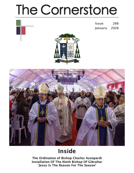 The Cornerstone magazine is published by The Catholic Diocese of Gibraltar. Editorial team: Deacon Bernard Farrell-Roberts and Pamela Cantos. The Cornerstone is entirely supported by advertising and donations. It is a not-for-profit magazine and is hand-delivered to churches, hospitals and many businesses around Gibraltar every month. Editorial is selected by Deacon Bernard Farrell-Roberts in liaison with the Catholic Diocese of Gibraltar. Neither of these parties is responsible for the accuracy of the information contained herein, nor do the views and opinions expressed herein necessarily reflect the views and opinions of either party. Advertisers are not endorsed by virtue of advertising in this magazine. The Catholic Diocese of Gibraltar reserves the right to refuse space to any submissions or advertisements. Efforts have been made to establish copyright owners of images, but if we have used your material, and have not credited you, please contact us.